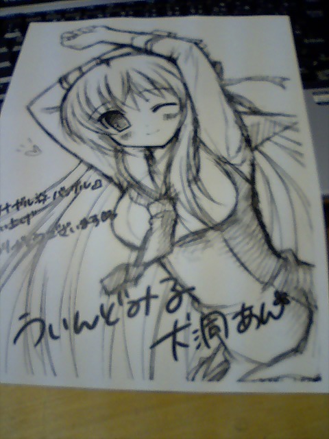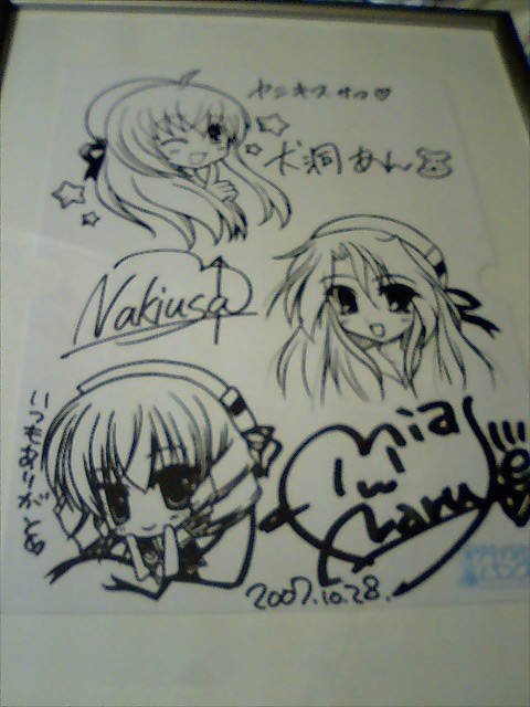 イベントは3人でのトークが約1時間弱、その後は整理番号順にサインとなりました。サインはゲームに入ってる台紙と同じものに、イラストが印刷されていて、それに犬さん、兎さん、未亜さんの順番にサインとなりました。犬さんと未亜さんの所ではツナガルー?バングルー!と1人ずつ・・・100回やるもん!@犬 とw