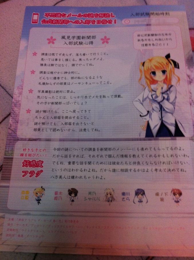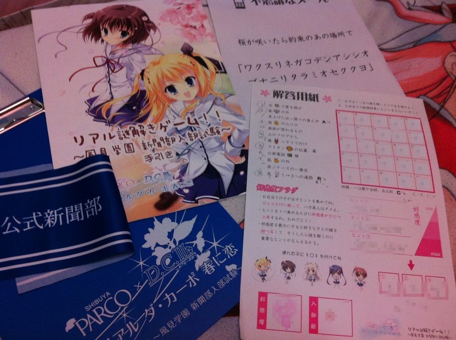 2012年05月09日 00:33 - 渋谷でリアル ダ・カーポ 春に恋「リアル謎解きゲーム!!〜風見学園新聞部入部試験〜」を受けてきました