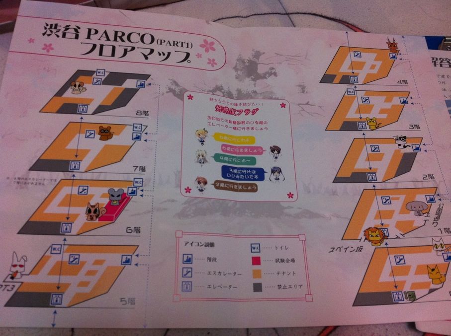 1〜8の場所は、それぞれ動物アイコンが書いてあって、会場マップにもその動物アイコンがあるので、なるほどその場所へ行けばいいのかー。でも番号順に行くとフロア移動が多くなるから、逆に上のフロアのところから攻めていこう、と8階からチェックしました。